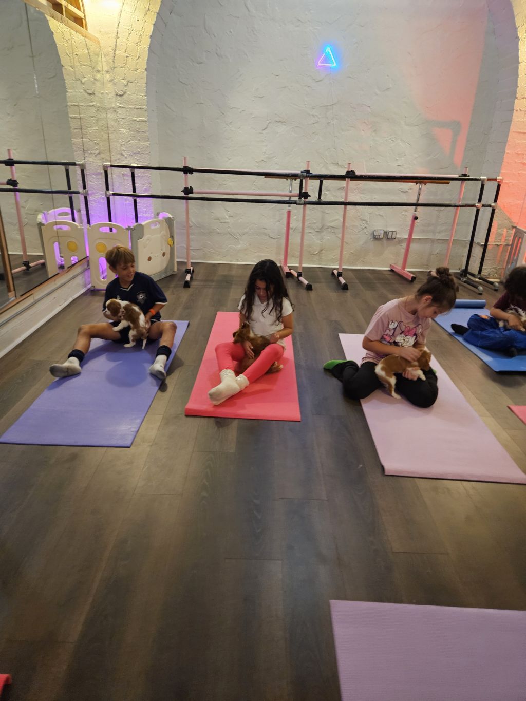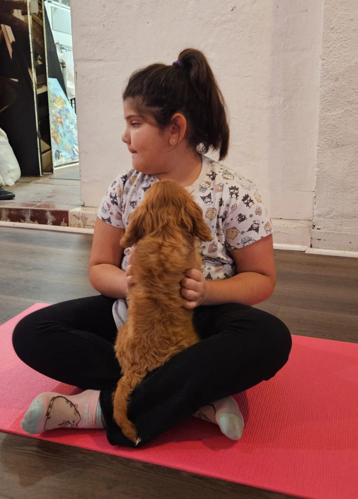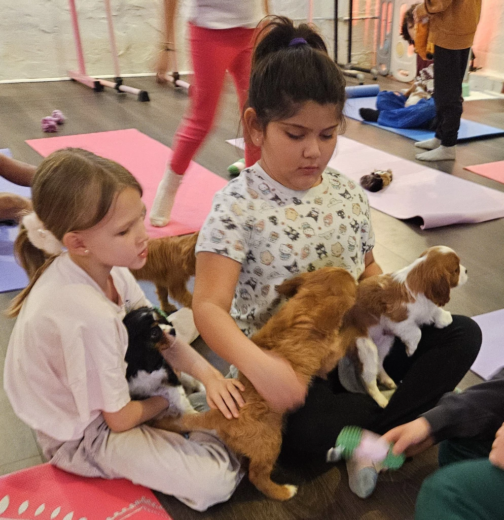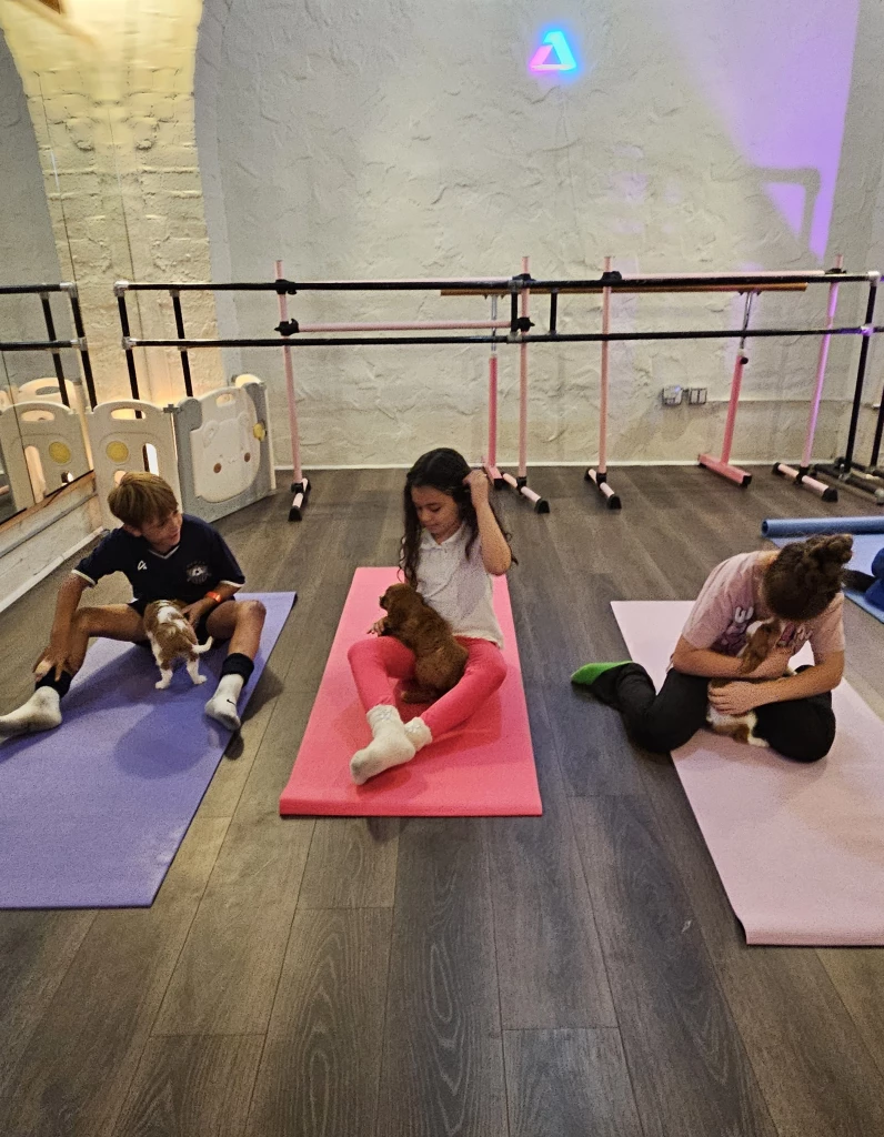 This isn’t a traditional yoga class, and it’s not free play either. Think of it as a quieter alternative to crowded playgrounds—a chance for kids to move their bodies, laugh with puppies, and unwind a bit. Along the way, kids naturally get familiar with a few simple movements they can enjoy again later.