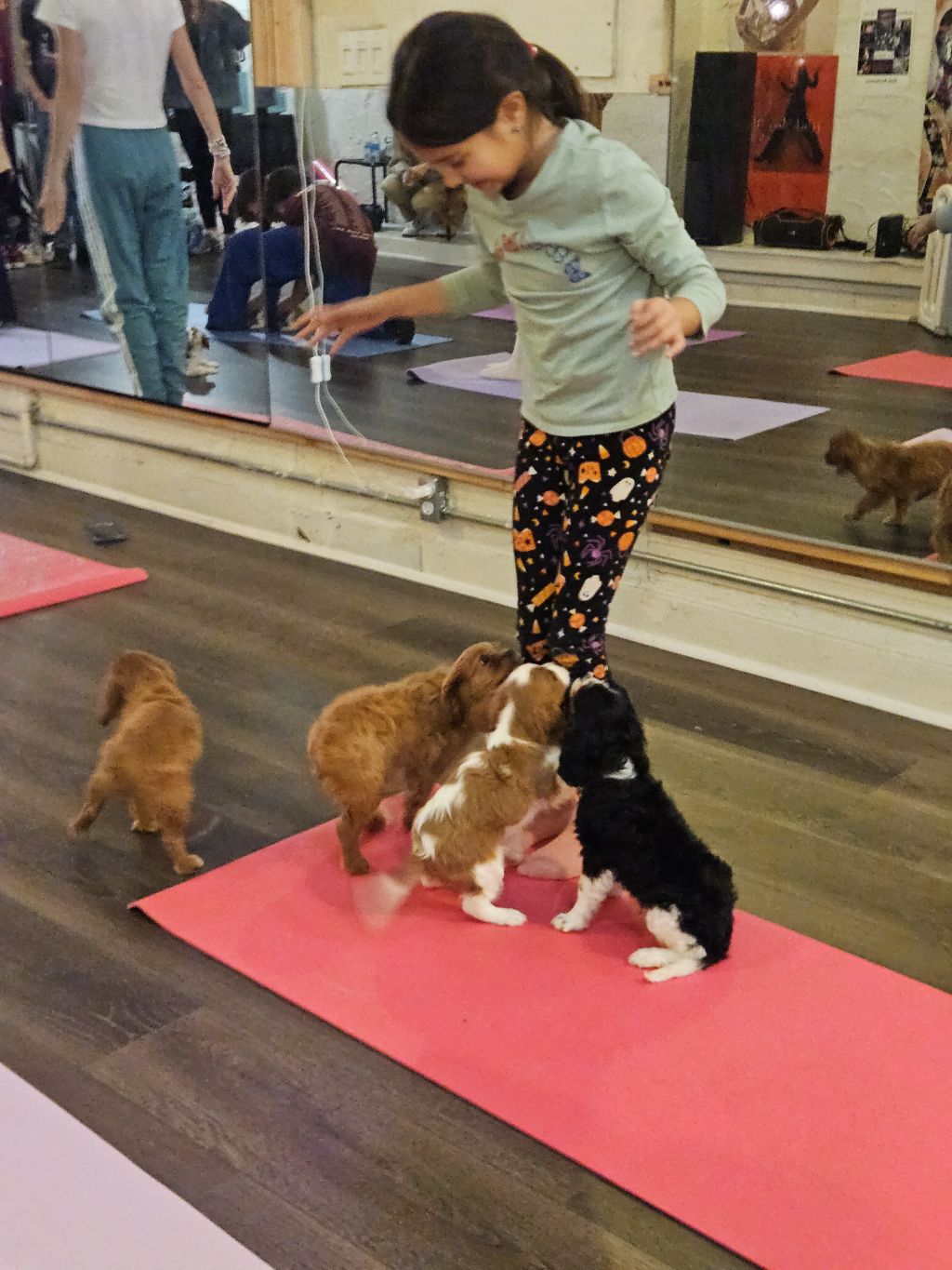 The whole experience was adorable chaos in the best possible way. Kids trying to hold yoga poses while puppies climbed all over them, everyone laughing, puppies doing puppy things — it was perfect.
